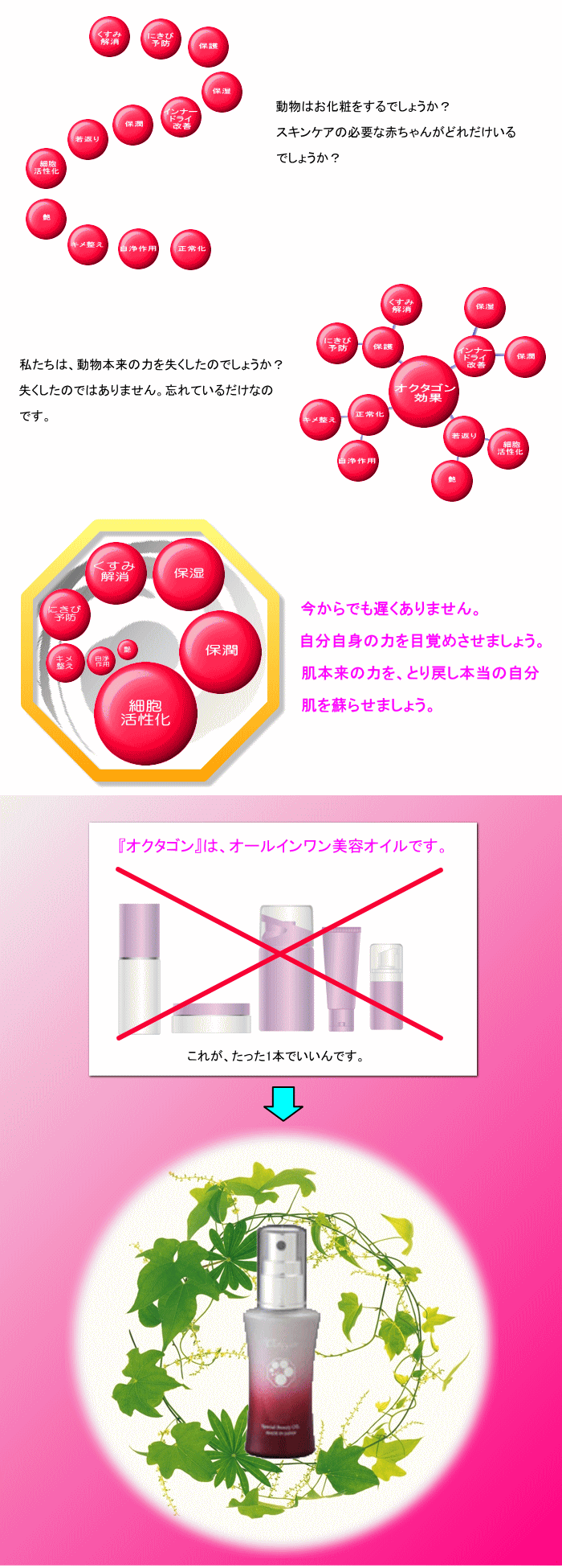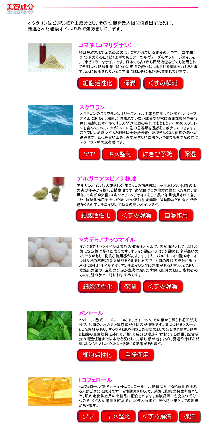 『オクタゴン』はオールインワンのエイジング美容オイルです。良質なビタミンEを含むオイルを精選し、ゴマ油・アルガニアスピノサ核油・マカデミアナッツ油を主成分とし、さらにスクワラン、トコフェロール、メントールを加えてつくられました。『オクタゴン』で”ツルッツルッ”を実感してみてください。 http://www.true-cent.co.jp/cosme.html