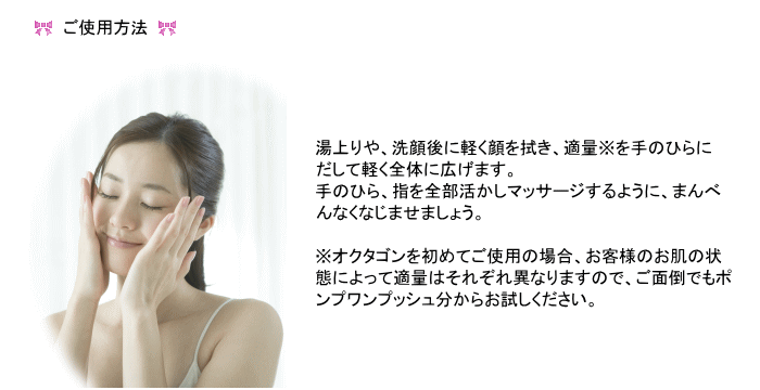 お肌の保護、正常化・インナードライの予防、若々しくいたいを追求し、これらに伴うくすみ、出来物の予防、保湿・保潤・細胞の活性化・艶・キメの整え・自浄作用をサポートするアイテム、つまりそのテーマを核とする意味で八角形を意味する『オクタゴン』と名付けました。