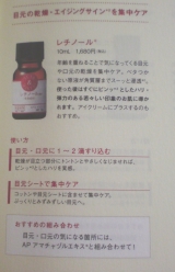 目尻目の下が特に気になったときにオススメと言うので、目元を中心につけてみました 少し黄色っぽい透明の液体で、肌にいい成分のニオイがしました 少し肌がべたつく感じもありますが、保湿効果がある感じ… 冬場はどうしても目元口元の乾燥が気になるので、レチノールすごくオススメです! 2012/01/08