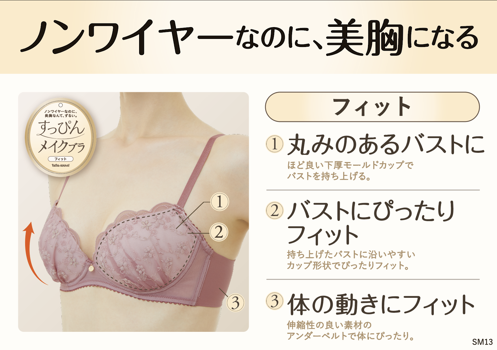 厚みのあるモールドカップでお胸を下から持ち上げます。