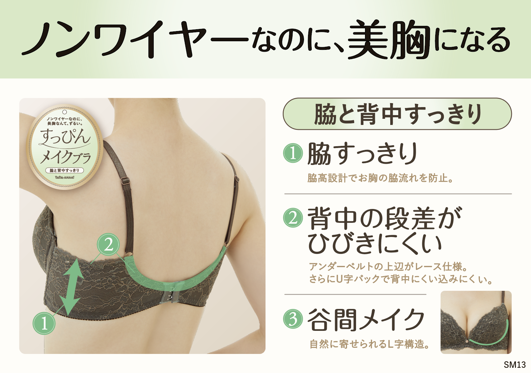脇高設計やU字バックで、気になる段差や脇の肉の流れを解消。