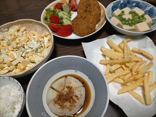 刻んだイカがたっぷり入っていて ぎっしり入っているので食べごたえが凄い 食べた事ない具の量に 家族全員びっくりですー これを食べると他が食べれない イカの食感は勿論ですが 生地がとても柔らかくて クリームコロッケのようなんです 夕食はこんな感じ 食べても食べても … 2024/05/02