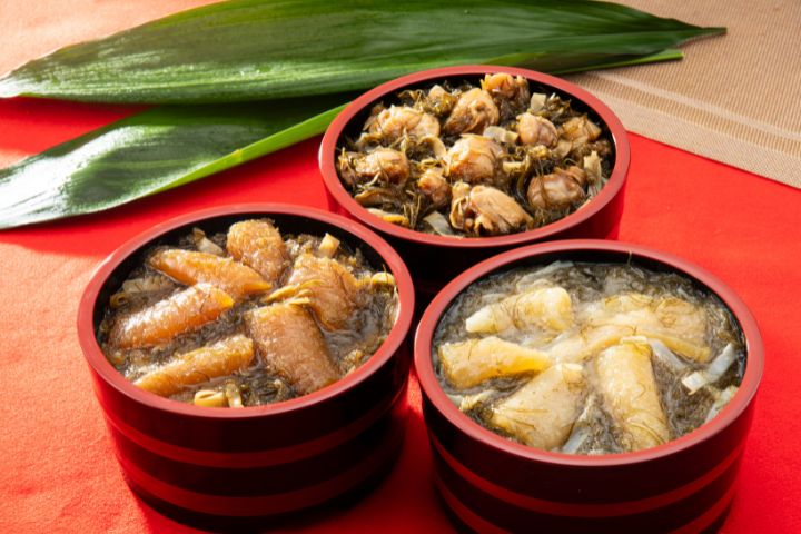 北海道産の真昆布、粘りのがごめ昆布、柔らかなイカなどの旨みを凝縮した3種の食べ比べが至福の時を刻みます。