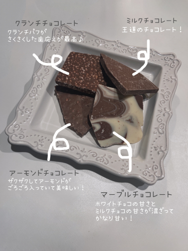 内容量:チョコミックス 320g (ミルク・ミルクマーブル・ミルクアーモンド・ミルククランチ)