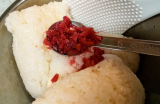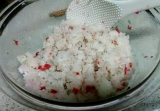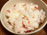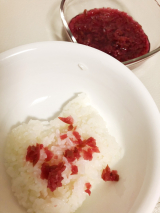 細かく刻んで、紅玉小梅の梅酢(赤梅酢)で漬け込んでいます。