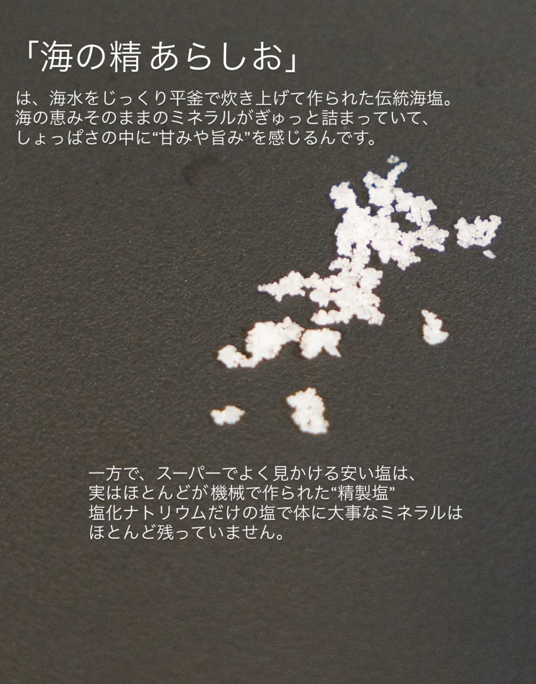 海の精の塩は海水の成分をバランスよく含んでいて、ただ塩辛いだけではありません。甘みや旨味・苦味を含んだ塩は、より食材のおいしさを引き立ててくれます。