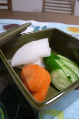 先日こんなものが届きました 『海の精 浅漬けのもと』 これから白菜がどんどん収穫されるので これはうれしいです さっそく冷蔵庫にあったもので浅漬け 1時間でちょどいい塩加減の浅漬けができました 昆布や椎茸の旨みが入っていておいしかったです♪ 実家では冬野菜の収穫時期… 2011/11/17