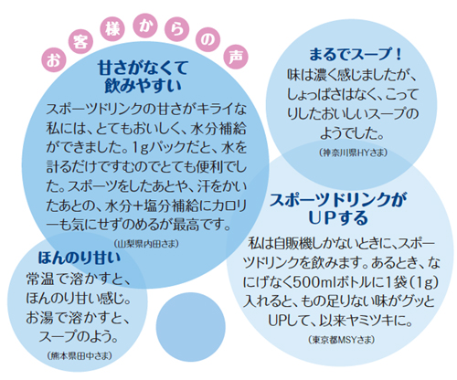 夏場の熱中症対策、運動などで汗をかいたときなどにオススメです。水などに溶かしてお飲みください。500mlのペットボトルに1~2袋が目安です。