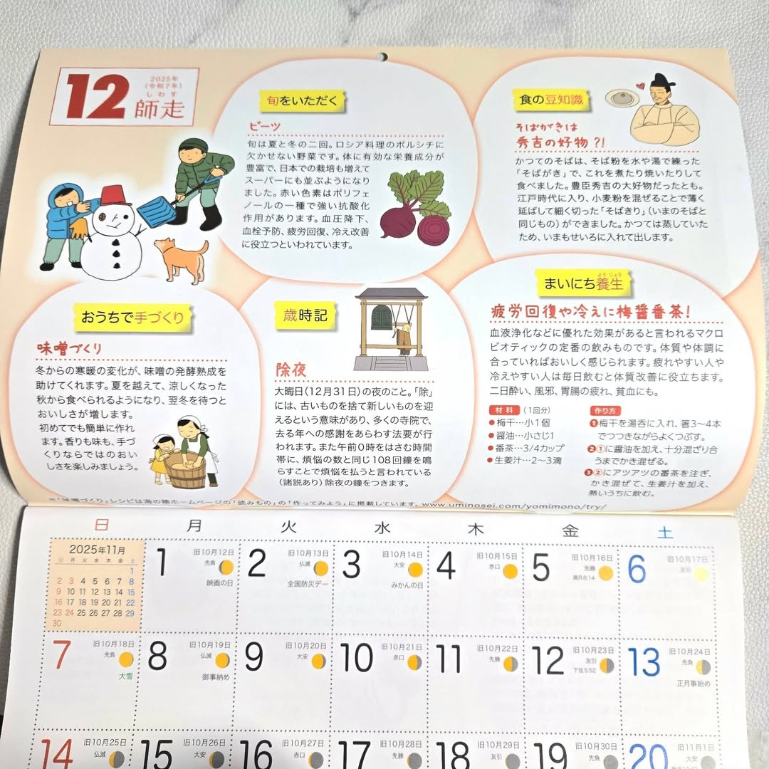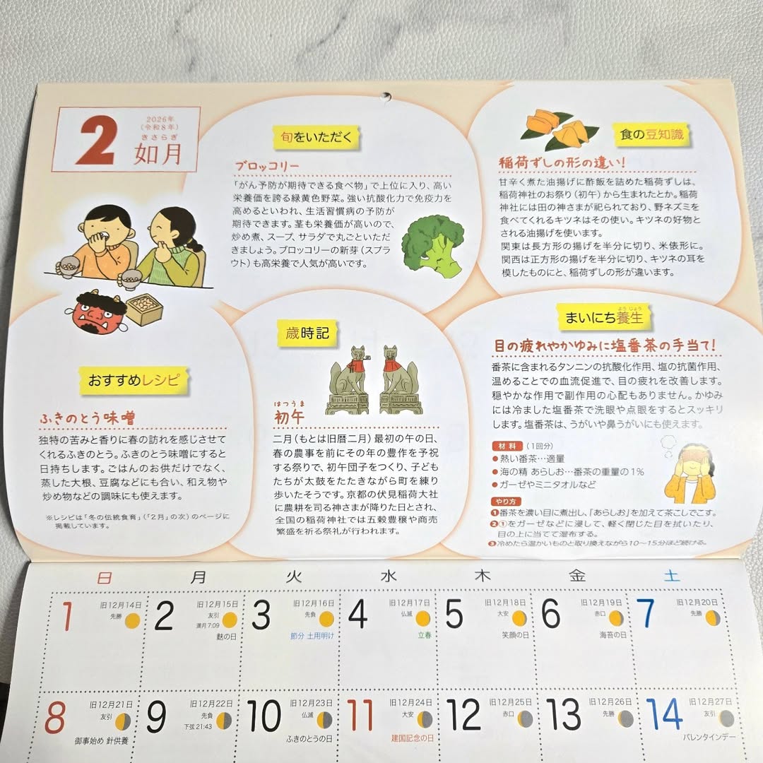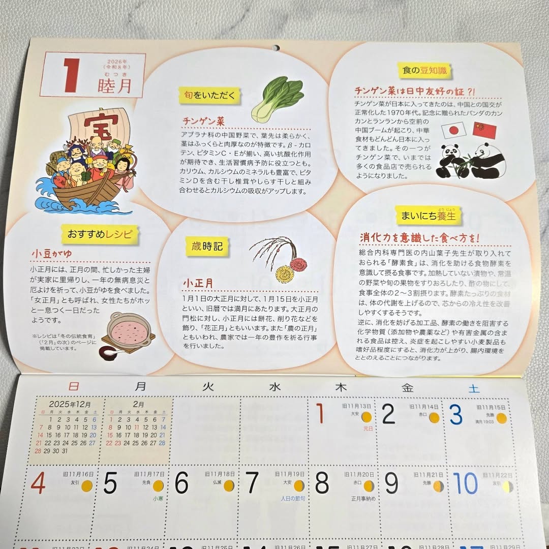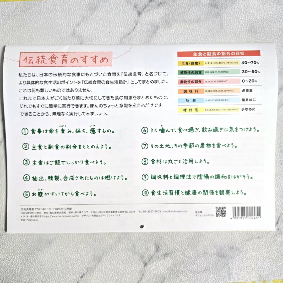 ⋆ 海の精 / 2026年版 伝統食育暦 \ 食に関する情報を中心にして、月の満ち欠け、二十四節気、旧暦など、ためになる情報が満載のカレンダーだよ 冠婚葬祭に欠かせない六曜のってるので便利だよ! 旬の食材や、調理法までのってるから参考になるよ! ハウス栽培や輸入で年中手に入る時代なので、旬ってわからなくなってるよね 改めて気づかせてくれてありがとう!だし、旬の食材をおいしく食べれるレシピも載ってるので作ってみたくなるよ! ありがとうございました♡ #PR #海の精ショップ #海の精 #海の精ショップ #伝統食育暦 #カレンダー #食育 #ていねいな暮らし #monipla #uminosei_fan
