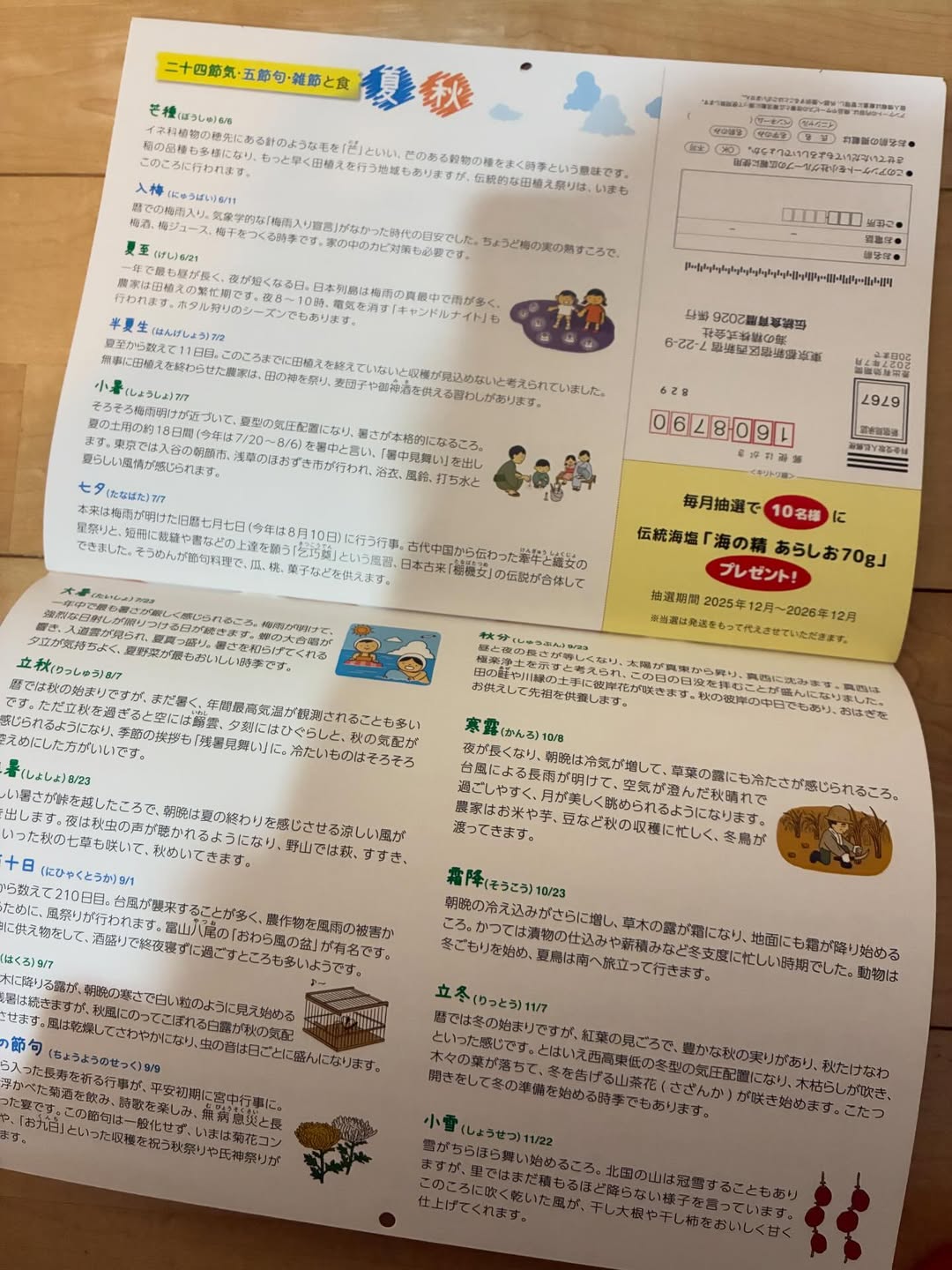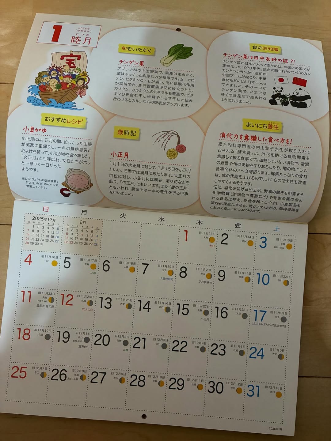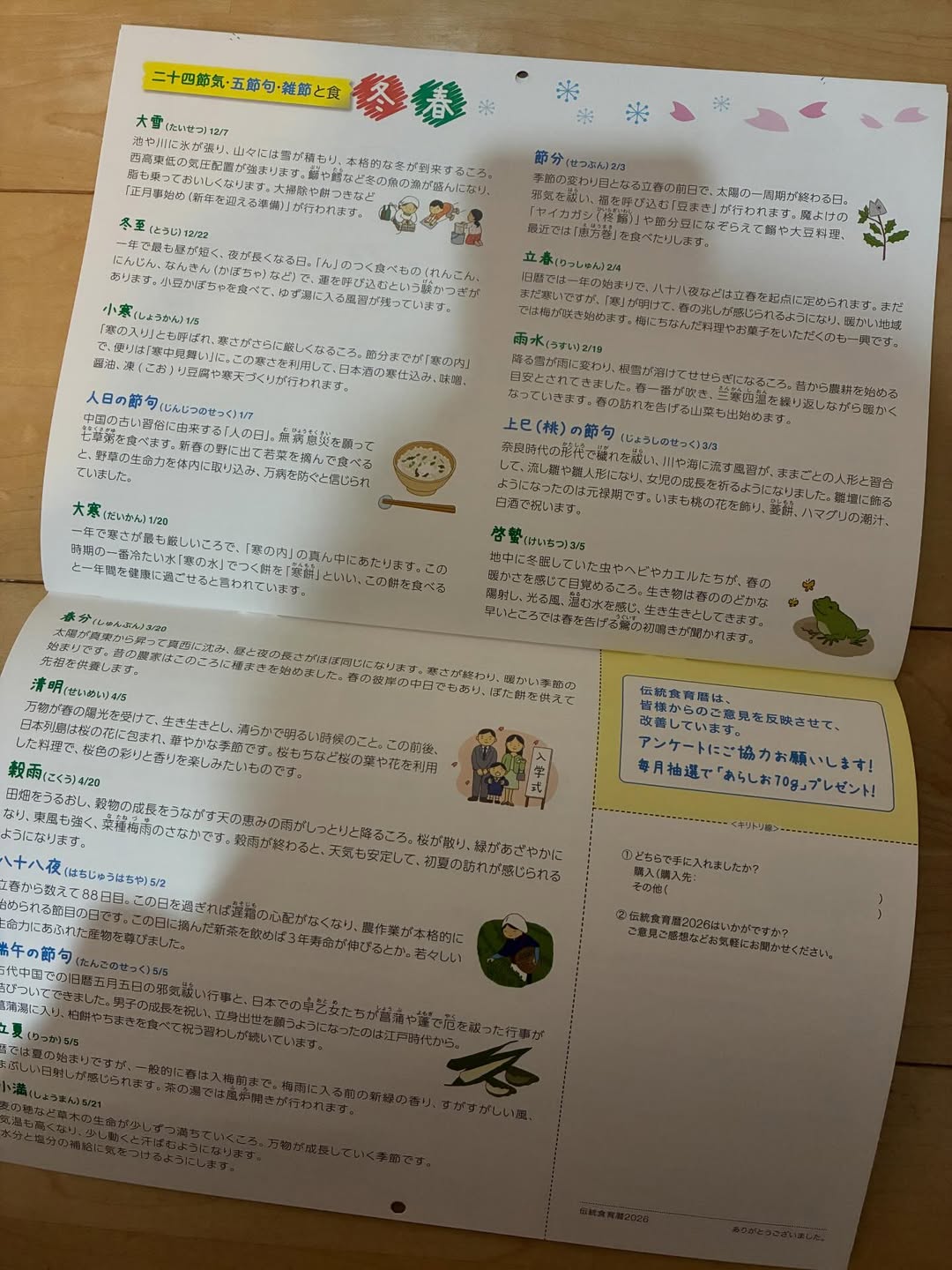 #PR #海の精ショップ #海の精 #海の精ショップ #monipla 伝統食育暦 食育カレンダー 伝統食育暦2026 発行 海の精クラブ 海の精クラブが提唱する「伝統食育」をカレンダーです✨ 食に関する情報を中心に構成し、月齢、旧暦、二十四節気なども盛り込まれているそうです🗓️ 月齢、旧暦、六曜、二十四節季、雑節を 記載されているそうです 余白には、家族の予定や食事の記録などが 書き込めるそうです📝 カレンダーの上部にはその月の旬の食材、 おすすめレシピ、食の豆知識、食養生、 おうちでお手当など。 季節の食事のポイントや季節のおすすめレシピ。 この他、二十四節季・五節句・雑節の解説や、 伝統食育に関するコラムも掲載されているそうです✨ 毎月のおすすめレシピや歳時記、食の豆知識や養生についても載っていて子ども達と一緒に読んで勉強にもなり、 楽しく使っています✨👦👧 書き込みもしやすいカレンダーでとても使いやすくていいです✨
