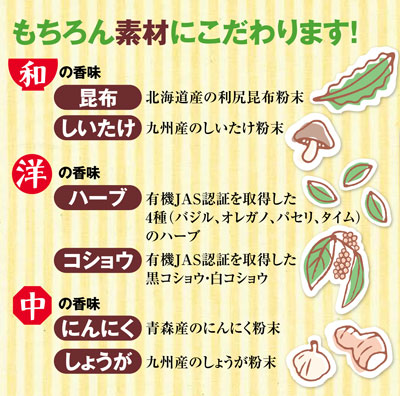 原材料:海の精 やきしお、有機バジル・有機オレガノ(アメリカ産等)、有機パセリ・有機タイム(オーストラリア産等)、有機黒コショウ・有機白コショウ(スリランカ産等)、昆布粉末(北海道産)、椎茸粉末(九州産)、にんにく粉末(青森産)、しょうが粉末(九州産)