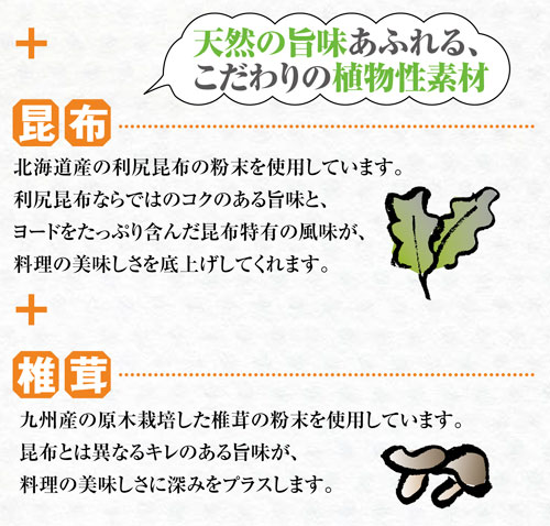 原材料:海の精 やきしお、昆布粉末(北海道)、しいたけ粉末(九州)