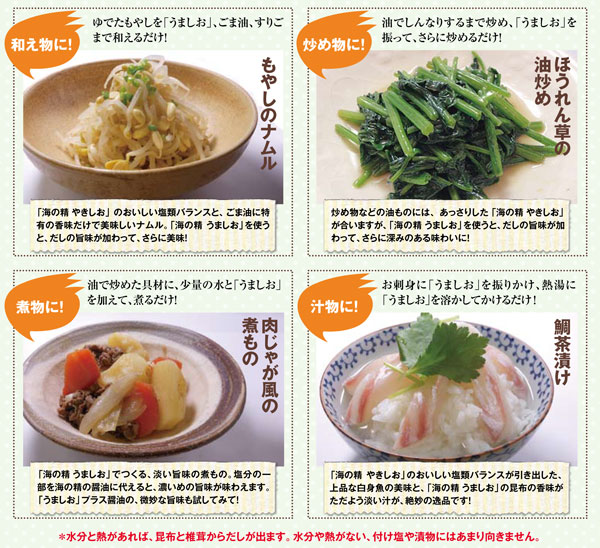 「海の精 やきしお」に、天然の旨味あふれる植物性素材をほどよくブレンドしました。