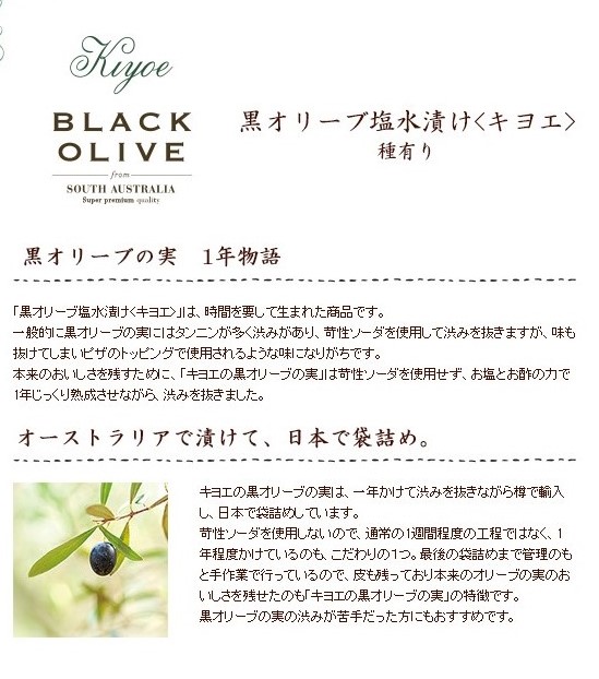 塩水とお酢で1年以上かけて作った<完熟>黒オリーブ。 一般的に黒オリーブの実にはタンニンが多く渋みがあり、苛性ソーダを使用して渋みを抜きますが、味も抜けてしまいピザのトッピングで使用されるような味になりがちです。本来のおいしさを残すために、「キヨエの黒オリーブの実」は苛性ソーダを使用せず、お塩とお酢の力で1年じっくり熟成させながら、渋みを抜きました。 お酒のおつまみよりも、まずはオリーブ炊き込みごはんに。