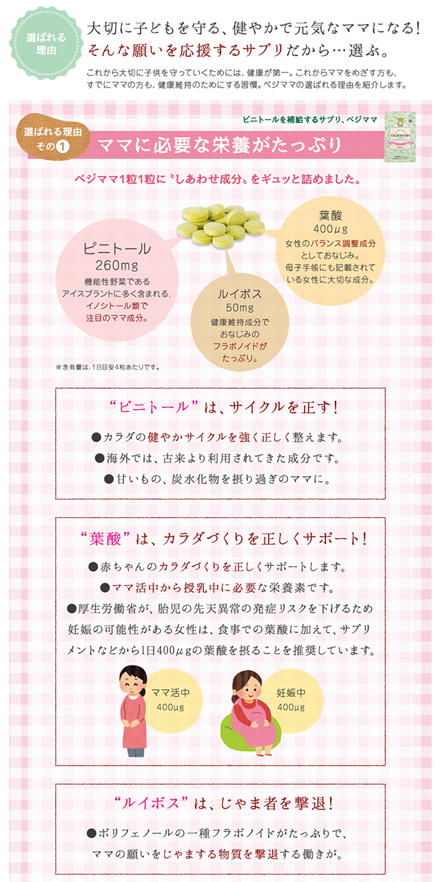 ピニトール、葉酸、ルイボス、ビタミンC、ビタミンEなどの成分配合。