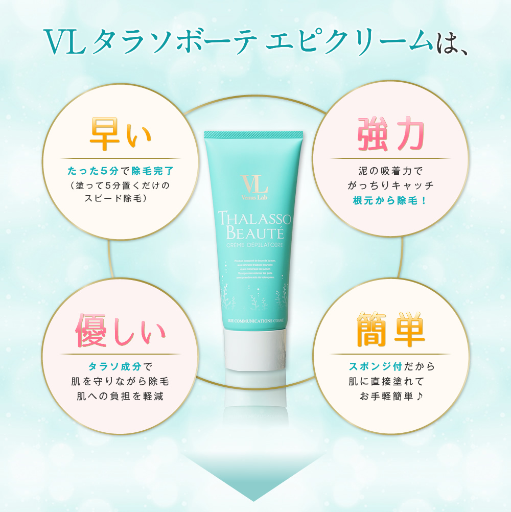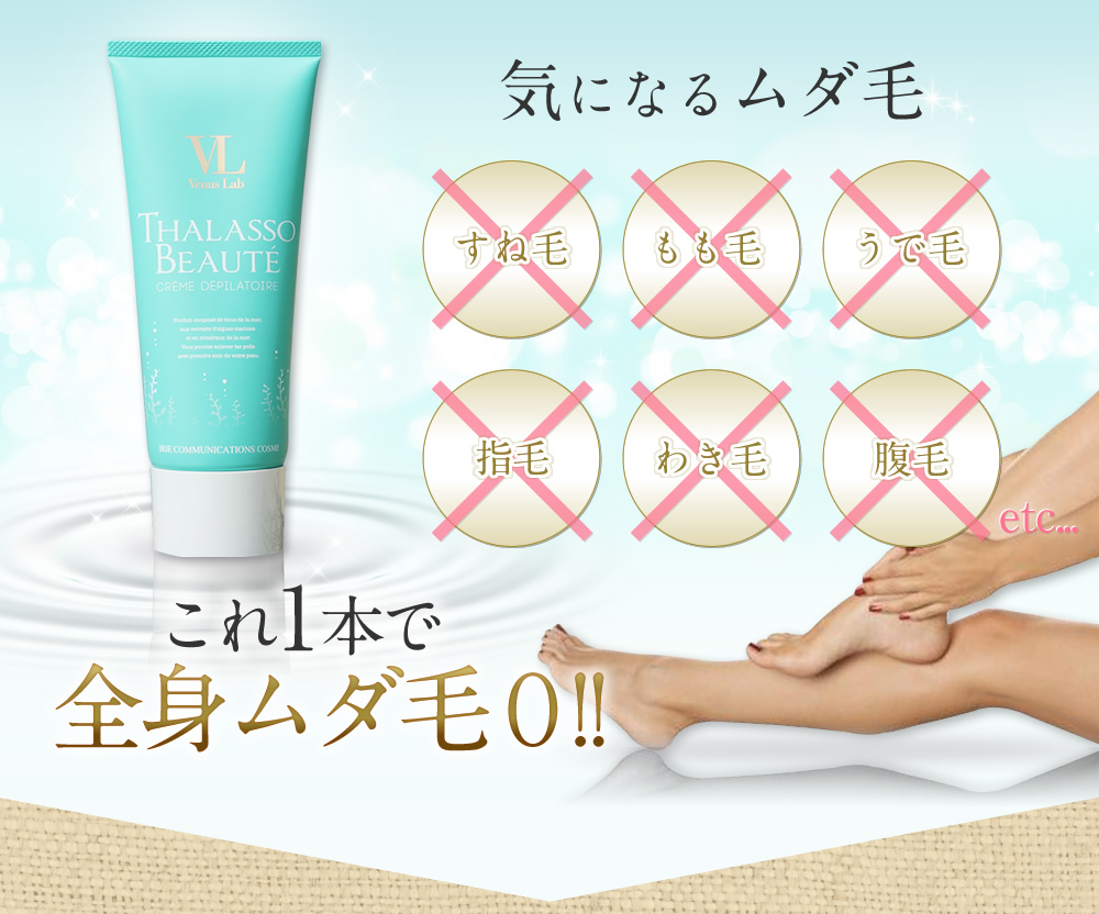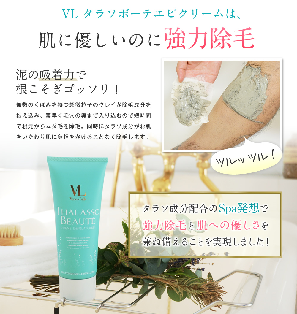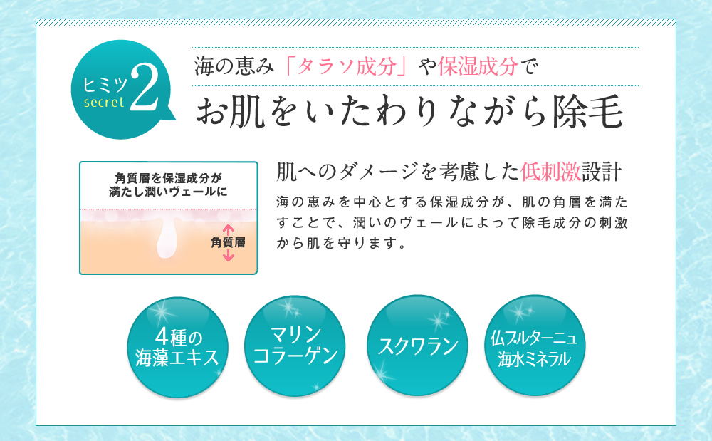 タラソ成分配合で、敏感肌の方も愛用できるほどお肌にとても優しく、それでいて強力除毛!