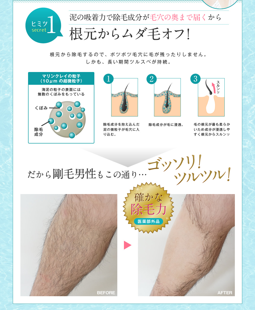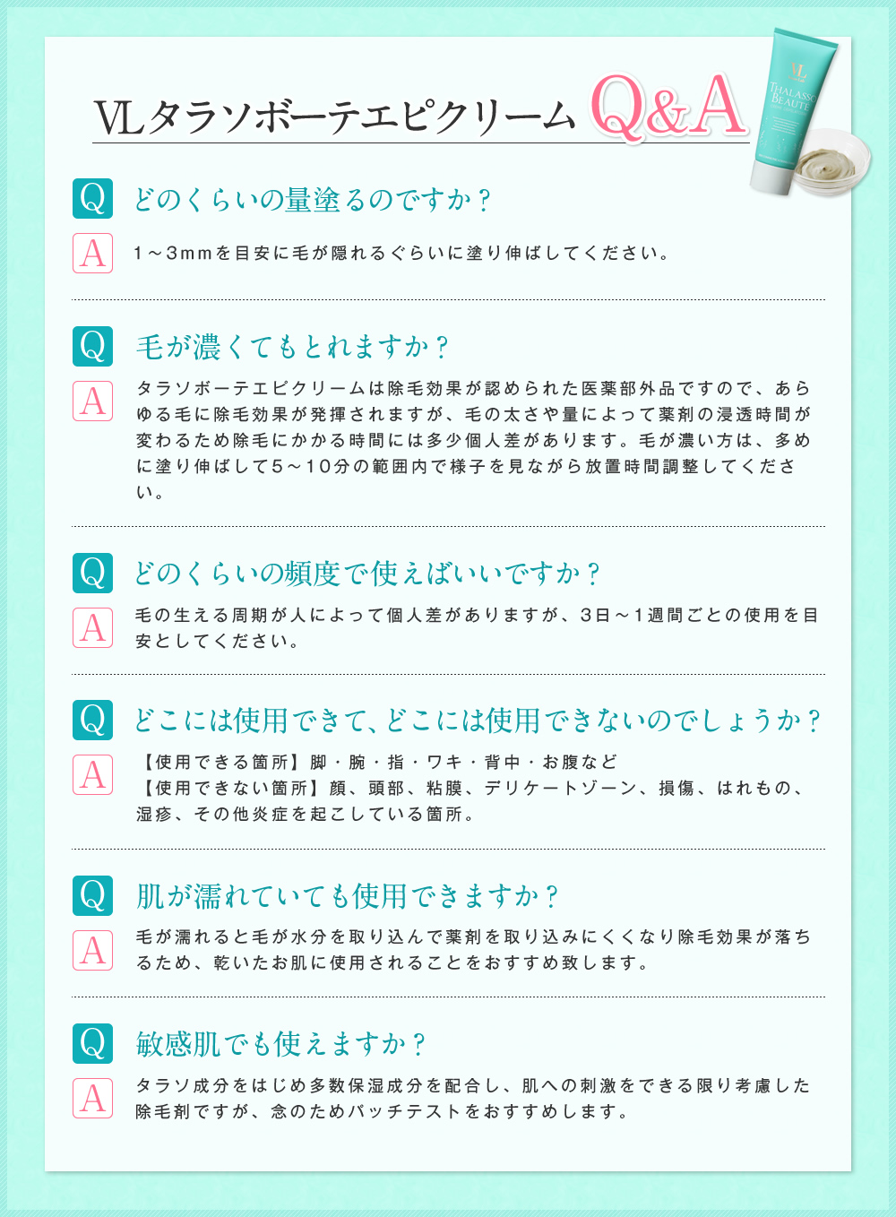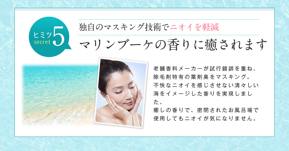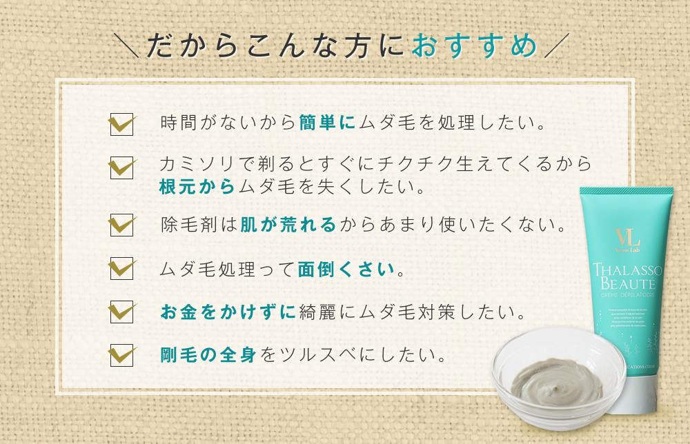 タラソ成分配合で、敏感肌の方も愛用できるほどお肌にとても優しく、それでいて強力除毛!