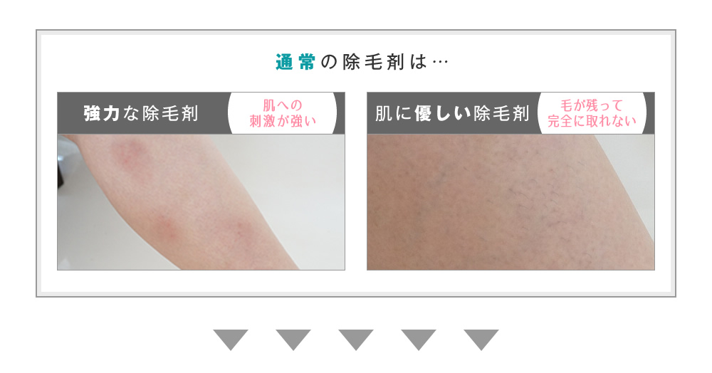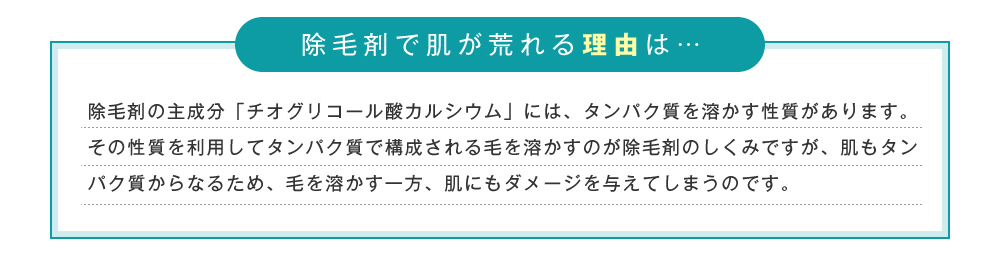 かなり敏感肌の私には、除毛剤はかなりキツい成分が使用されているイメージがあり、肌には負担がかかり、肌トラブルの原因になるかもしれないと思っていました。