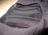 ●凹凸指圧クッション:背中のくぼみに沿わせた設計なので、凹凸がアウターにひびきにくい。