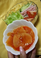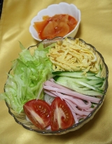 ちょっと珍しい野菜(ヤーコン)を麺に練りこんで作った『ヤーコン冷麺』。ヤーコンの甘味を感じるコシのある麺に、酸味のきいたさっぱりのスープ、特製の大根キムチが食欲をそそる。