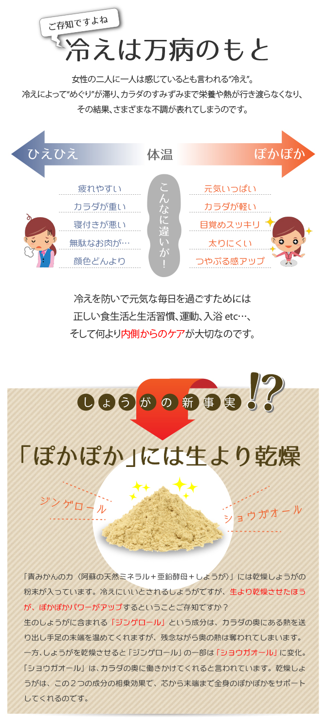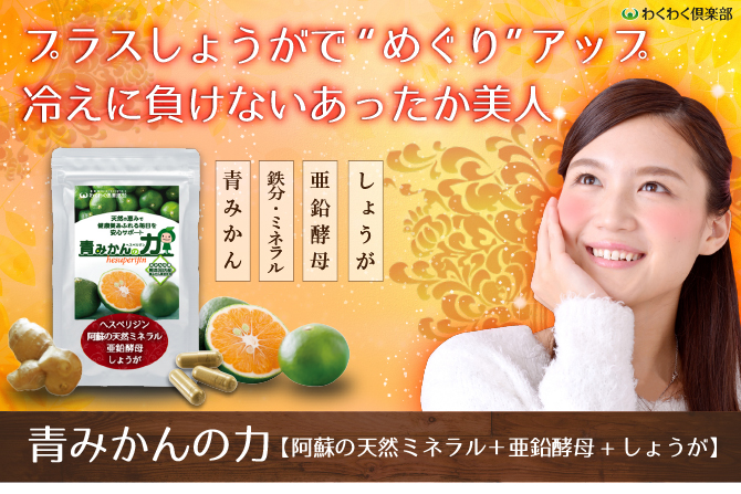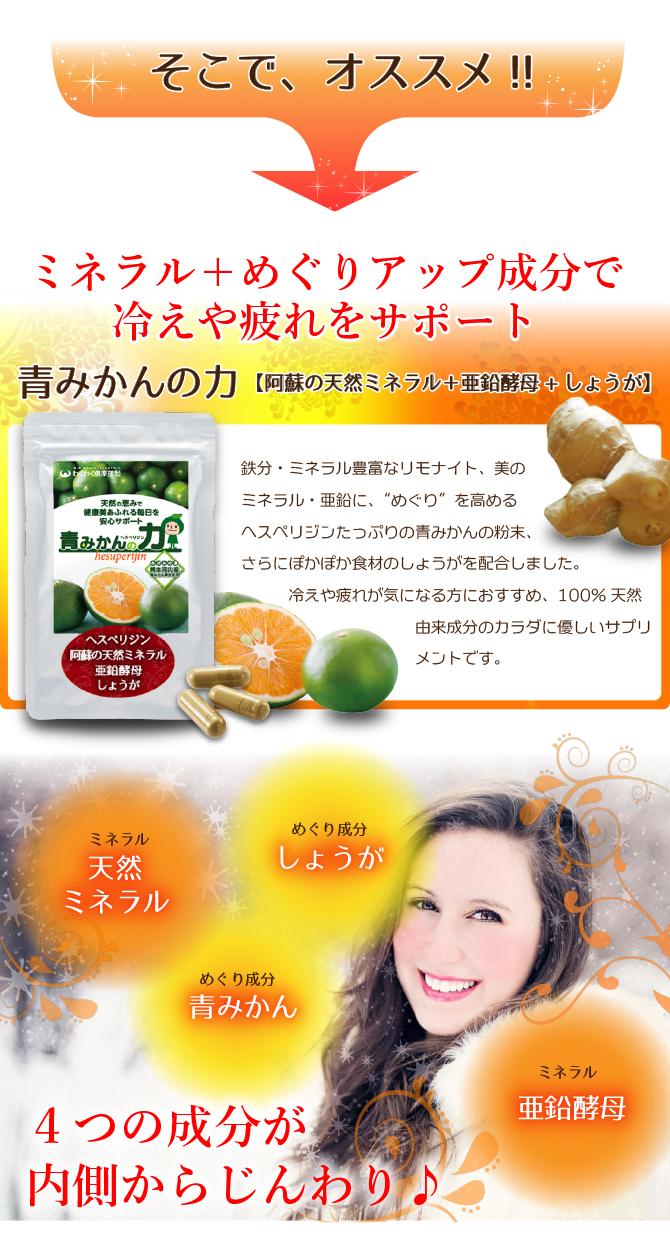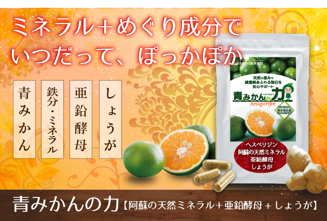 青みかんの力阿蘇の天然ミネラル+亜鉛酵母+しょうがのサプリメントです芯からぽかぽか疲れもカバーしてくれる...