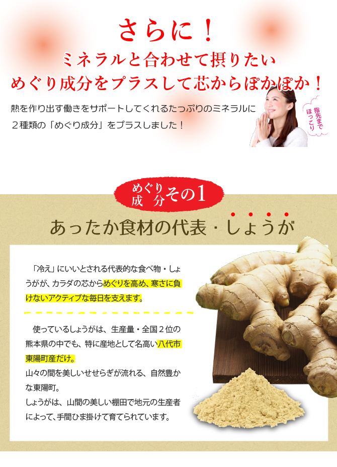 13種類の必須ミネラルに、めぐりを高める青みかん粉末、 ポカポカ食材しょうがをプラスして 芯からあったか&ダルさケア