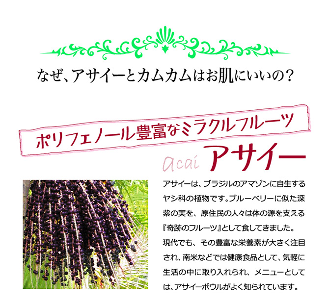 紫外線対策とエイジングケアとして毎日摂り込んでいるコチラアサイーカムカムアサイーだけカムカムだけという...