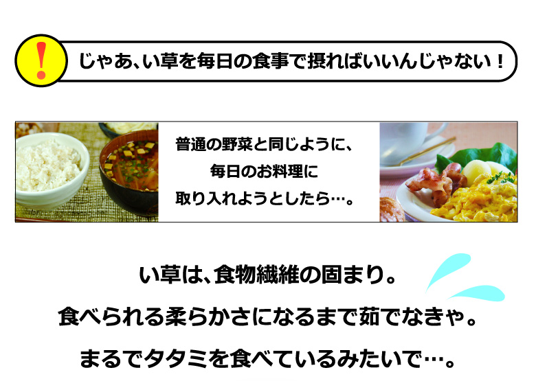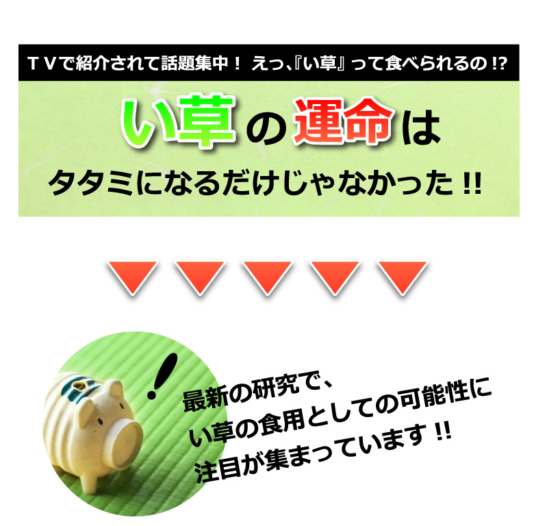 前回までのい草の話。い草の良い話①:主に敷物の話い草の良い話②:主に香りの話今回は、食べるい草の話ですっい草って実は食べられるんです。イケは数年前に知り驚きましたい草を細かく摩り下ろし灯心部分を取り出し、煎じれば感染の炎症を抑え、水腫改善に。灰にした物を飲用すれば喉の疾患を和らげる。(灯心=昔は行灯の灯心に使用されていました)入浴には美肌や炎症、切り傷にも。…す、凄いねどういう成分があるかというと…糖質・脂質・蛋白質・食物繊維・ビタミンA・ビタミンC・ビタミンE・カルシウム・マグネシウム・鉄・亜鉛・カリウム...