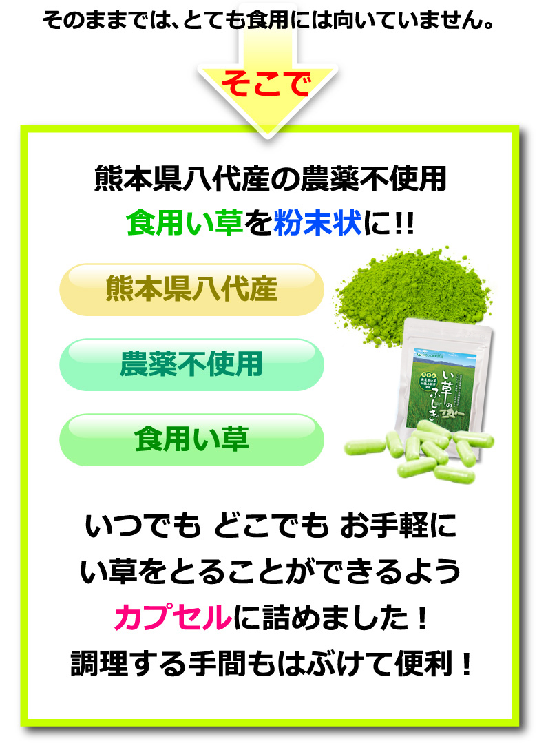 わくわく倶楽部(株)のい草のふしぎ粉末をお試ししました。IMG_20150526_103114158.jpgい草って畳の原材料として約1,100年以上前より用いられているみんなもよく知っているあれですニコしかし、きらきら!!イグサは昔、薬草だったきらきら!!い草は日本最古の本草書である本草和名にも記載され、日本最古の医書である医心方では薬草としての記述があります。更に江戸時代に編纂された百科辞典である和漢三才図会や薬草が記載されている本草綱目啓蒙においてもイグサの薬草としての歴史を紐解くことができます。い草を食べると便通、ウエストの減少効果もあるん...