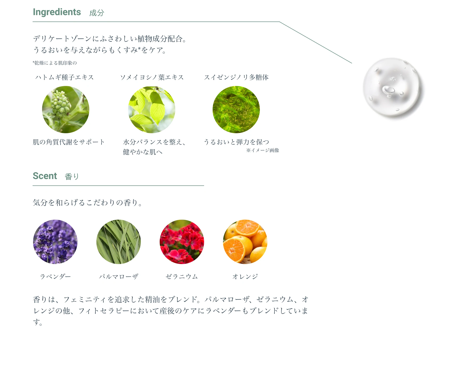 香りは、フェミニティを追求し、パルマローザ、ゼラニウム、オレンジの他、フィトテラピーにおいて産後のケアに用いられるラベンダーの天然精油もブレンドしています。