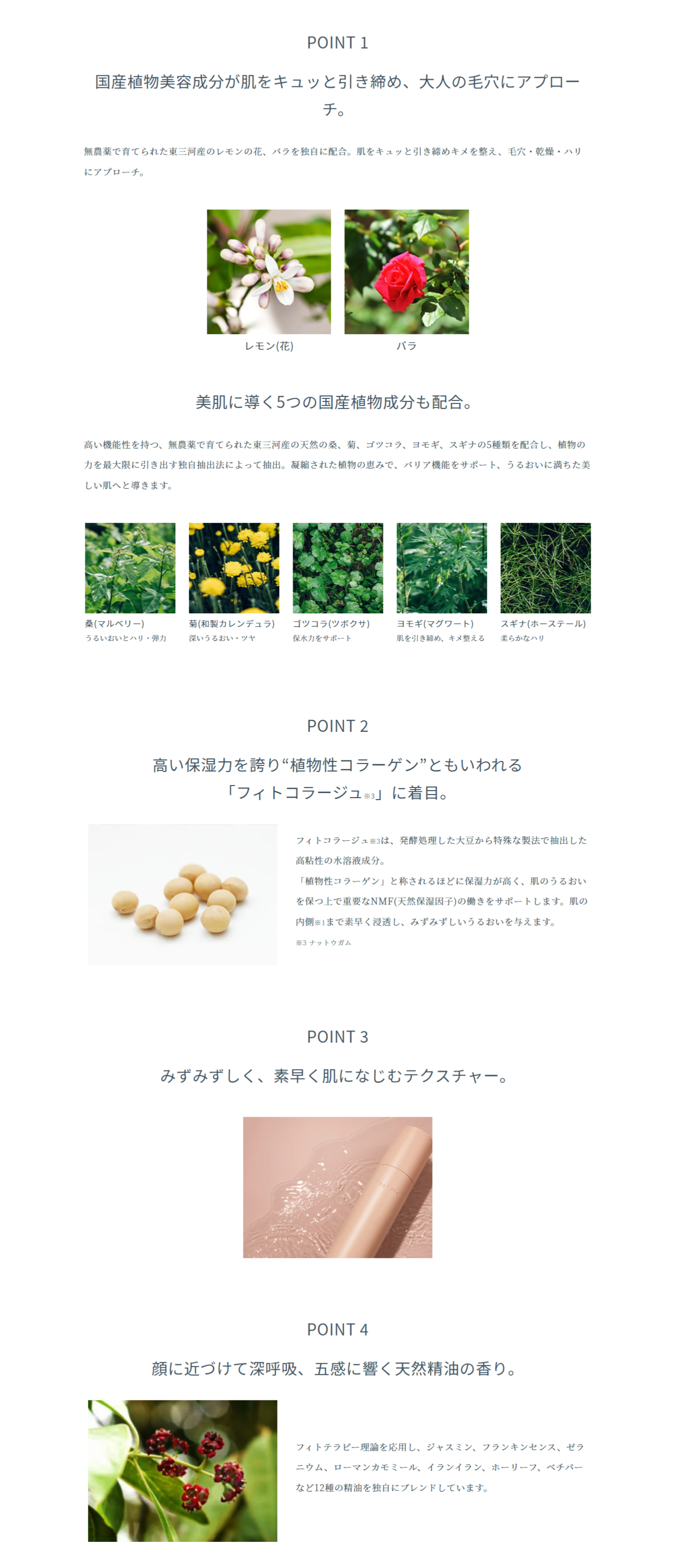 「香りに癒やされ、心までケアしてくれる」「さらりとしているが、しっかりうるおう」などのお声を頂いています。