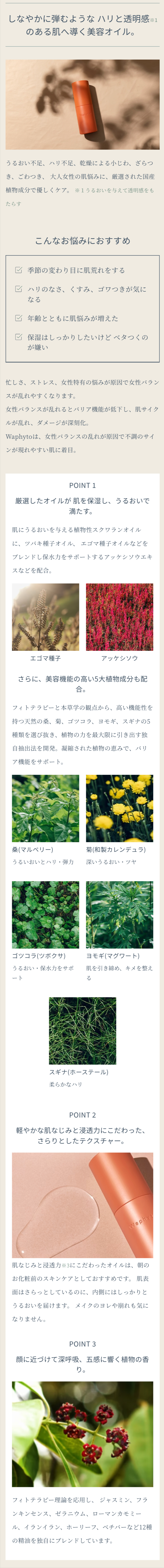 肌のごわつき・乾燥が気になる方に。ごわつきがちな肌を柔らかく整える美容オイル。 植物性スクワランにツバキ種子オイル、エゴマ種子オイルなどをブレンドし、保水力を高めるアッケシソウエキスも配合。厳選したオイルが肌を保湿し、うるおいで満たします。 軽やかな肌なじみと浸透力*にこだわったオイルは、お手入れの最後や、洗顔後すぐの肌、朝のお化粧前のスキンケアとしてもおすすめ。 肌表面はさらっとしているのに、内側にはしっかりとうるおいを届けます。 * 角質層まで レビュー数 : 29 |