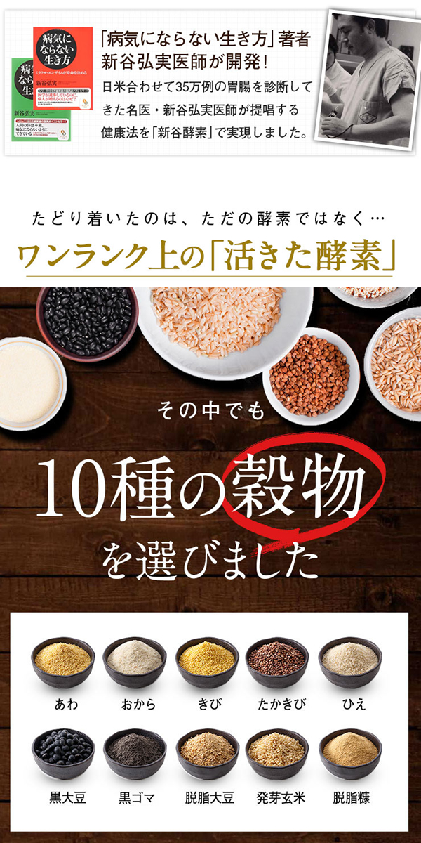 「新谷酵素」は酵素成分を含んだ食品(小麦、黒大豆など)を原料にし