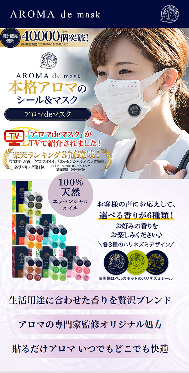 ウィズコロナの新しい生活スタイルの中で、マスクの着用が当たり前になりました。私たち富士産業は、コロナ禍の不安やマスクへの不満をアロマの力で解消できないかと考え、アロマシール&マスクセット「AROMA de mask(アロマdeマスク)」を開発しました。アロマの力をウイルス対策や心身のリフレッシュに役立てていただけたら幸いです。 レビュー数 : 2267 |