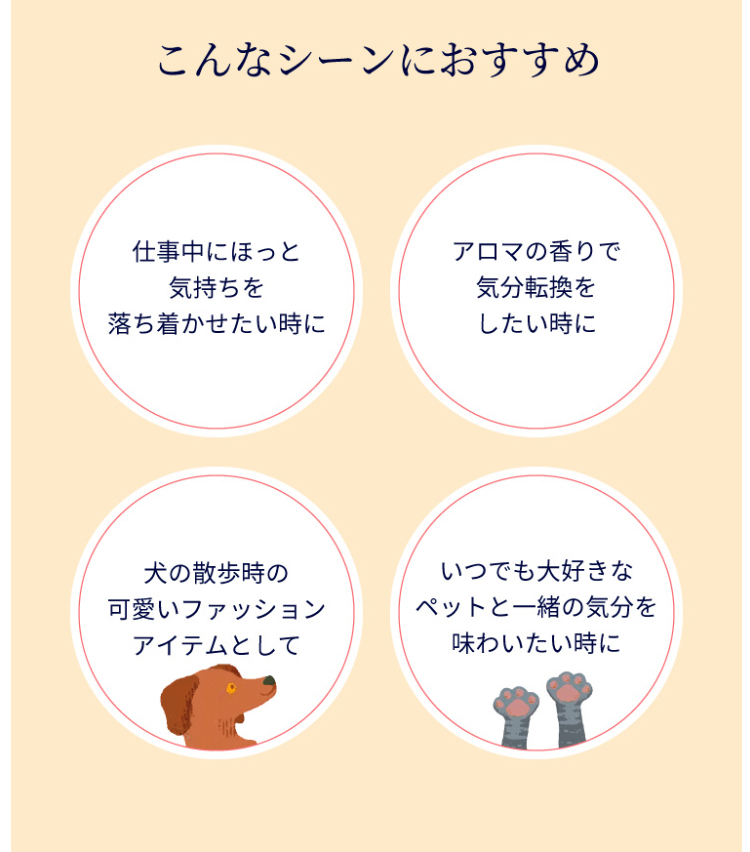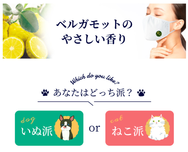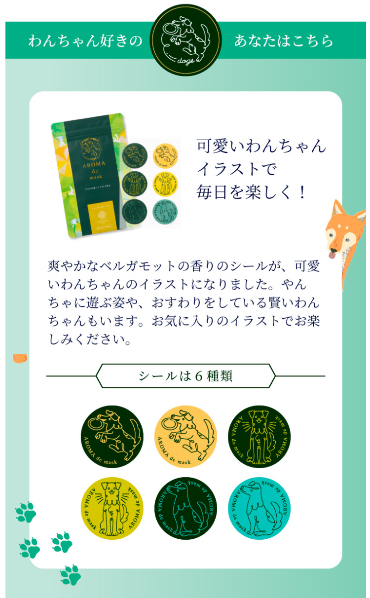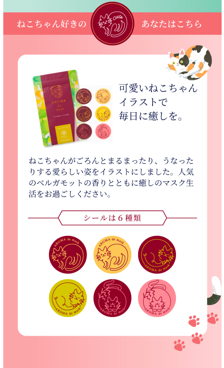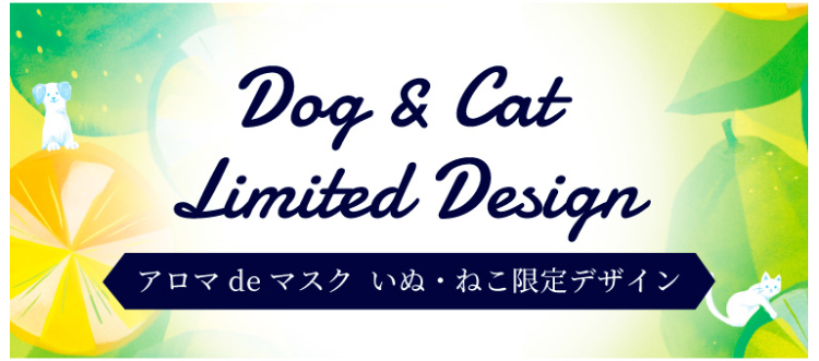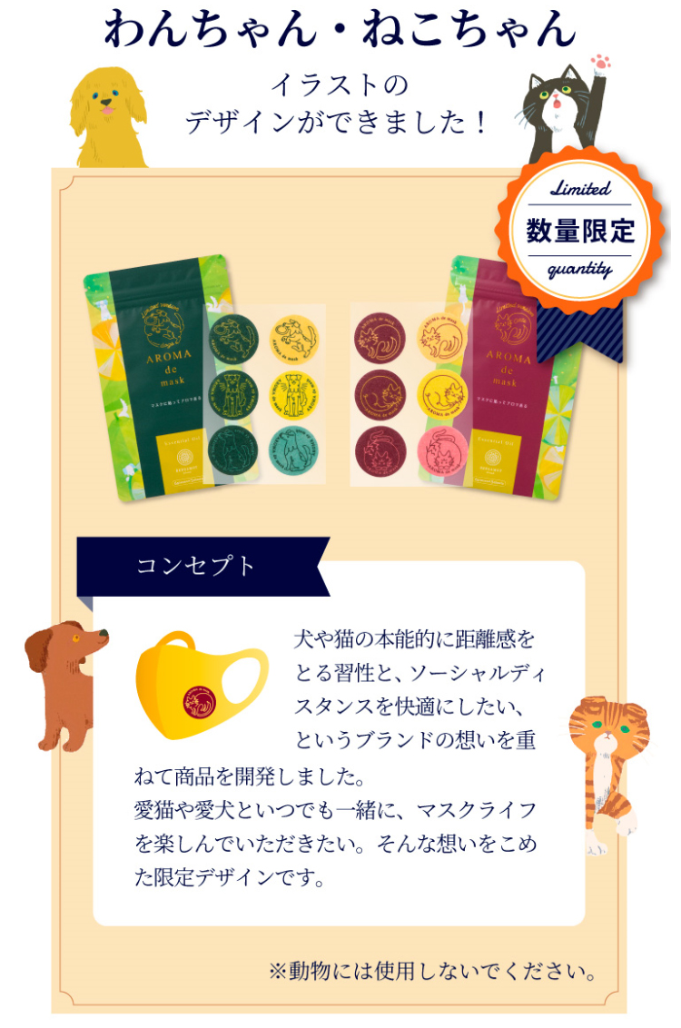 「マスク生活やソーシャルディスタンスを快適にしたい」というアロマdeマスクのコンセプトを、本能的に距離をとる犬や猫の習性に重ねて生まれた限定のシールデザインです。マスクライフを楽しみながら、愛猫や愛犬といつでも一緒に。そんな想いをこめました。