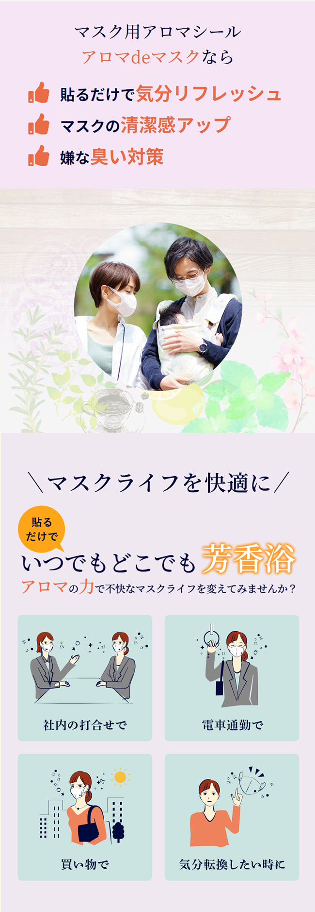 ウィズコロナの新しい生活スタイルの中で、マスクの着用が当たり前になりました。私たち富士産業は、コロナ禍の不安やマスクへの不満をアロマの力で解消できないかと考え、アロマシール&マスクセット「AROMA de mask(アロマdeマスク)」を開発しました。アロマの力をウイルス対策や心身のリフレッシュに役立てていただけたら幸いです。