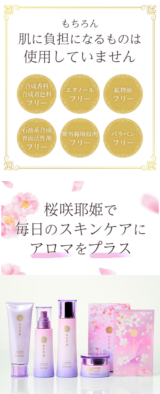 桜をイメージした天然精油の香りとたっぷりの美容液でがんばったお肌と気持ちに