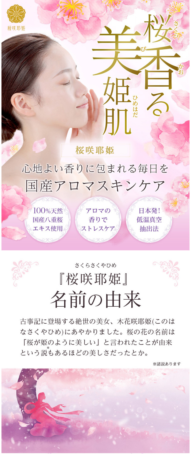 出雲の国 島根県のソメイヨシノから抽出したエキスを贅沢に配合した桜咲耶姫シリーズのスペシャルケアアイテムです。