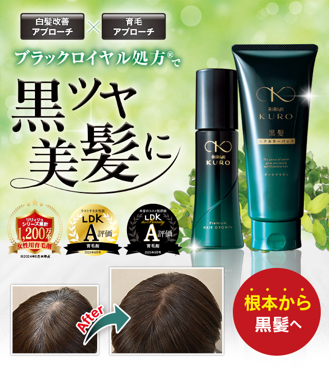 女性のための育毛剤「薬用リリィジュ」の発売から20年、さらに女性の髪の悩みにお応えするべく誕生した『リリィジュKUROシリーズ』。 ■リリィジュKURO 白髪世代のお悩みに応えた女性のためのプレミアム育毛。 育毛剤は使いたいけど、白髪染めの色落ちが気になる。そんなお悩みにお応えし、薄毛・抜け毛に効果を発揮しながら、カラーの色持ちを格段にアップ。 ■黒髪シャンプー・トリートメント 白髪を自然に目立たなくするシャンプー&トリートメント。 毎日のシャンプーとトリートメントを変えるだけで、徐々に白髪を目立たなくし、染めた髪色の色持ちもアップ。無添加・ノンシリコンと頭皮や髪にやさしい処方で自然な黒髪に ■黒髪ヘアカラーパック 週1回、白髪をしっかり染めたい方のヘアカラーパック。 染毛成分が髪表面のマイナスイオンと結合してキューティクルの隙間から浸透するため、1回の使用でしっかり白髪をカバーしならが、仕上がりは指通りよくつややかに。 レビュー数 : 82 |