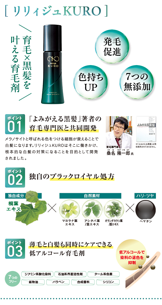 女性の薄毛に寄り添って30年以上、『リリィジュ』ご愛用者様のお声をもとに誕生した 「薬用リリィジュKURO」女性の薄毛を改善し、さらに黒髪も育てる育毛剤。
