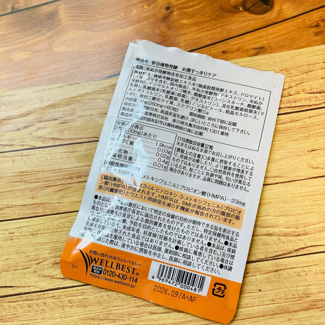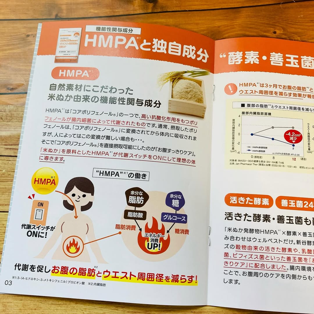 「新谷植物発酵 お腹すっきりケア」は、シリーズ累計販売個数490万個突破の新谷酵素シリーズ初の機能性表示食品です。お腹の脂肪が気になる方へおすすめの米ぬか由来の機能性関与成分HMPAと新谷酵素シリーズの特徴である穀物由来酵素や24種の善玉菌をたっぷり配合しました。HMPAには、臨床試験でお腹の脂肪とウエスト周囲径を減らす効果が確認されています。