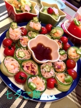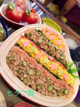 おはですまた雨降り出した今朝のリクエストは、、アンパンマン&ロールパンナのクリームパンチョコペンでちまちま描いたよで、昨日は、七夕毎年恒例のおうちご飯鶏そぼろに炒り卵、明太子など乗せたそぼろご飯に、、キュウリをピーラーで長くしたのをクルクル巻いてセルクルっぽく使って、中に梅そうめんをインキュウリのカ… 2015/07/08