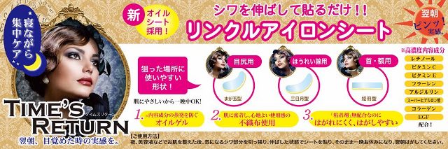 気になる、しわを伸ばして貼るだけ!翌朝!ピーン!!!リンクルアイロンシートタイムズリターンのモニター募集、復活です♪今回は首・額用(短冊形4枚入り)を2個、30名様にモニタープレゼント!短冊形は首・額用ですが、そのスタンダードな形を活かして目元や口元のご自分の気になるに合わせてはさみでカット!アレンジして使える、と大好評~♪