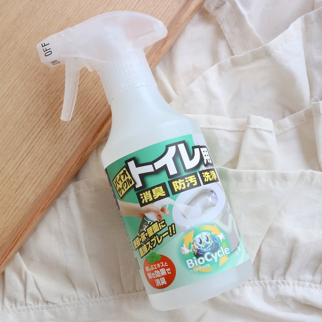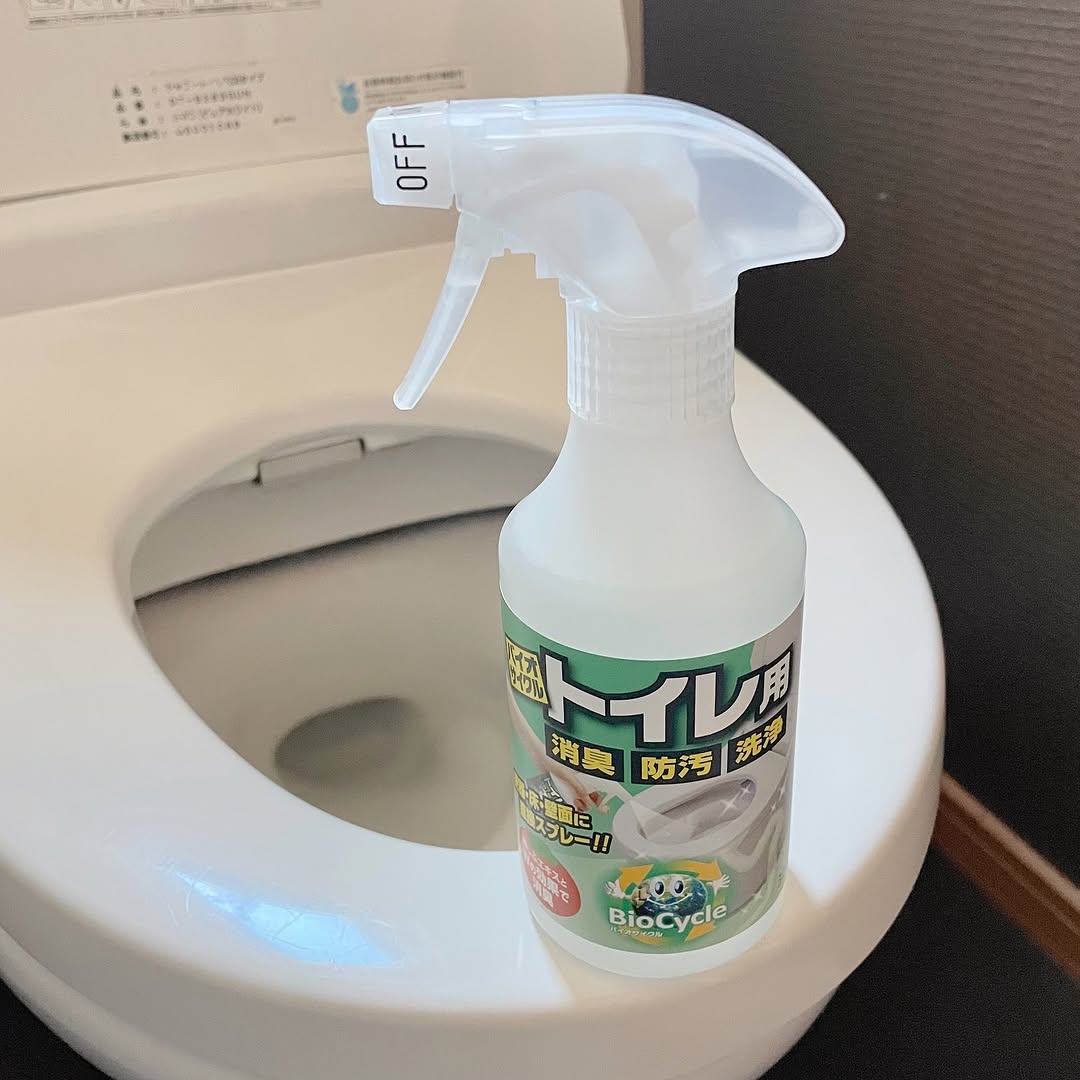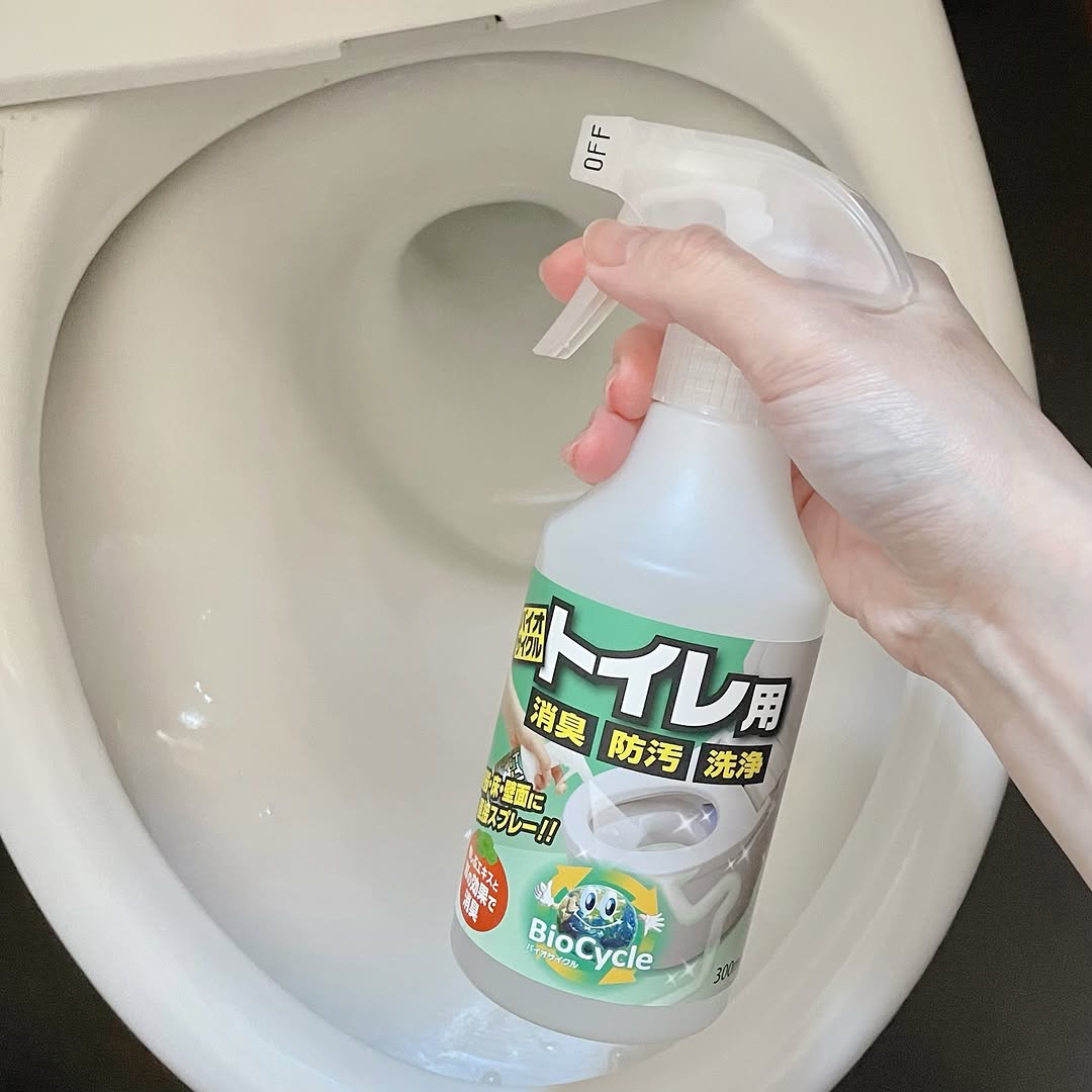 バイオサイクル トイレ用は、天然のバイオ菌が、汚れや臭いを分解!便器・壁・床・パイプ内までまるごとキレイが続くエシカル洗剤です。トイレ掃除後にスプレーするだけで、汚れが付きにくくなる防汚の働きもあるから、家事ラクまちがいなし!