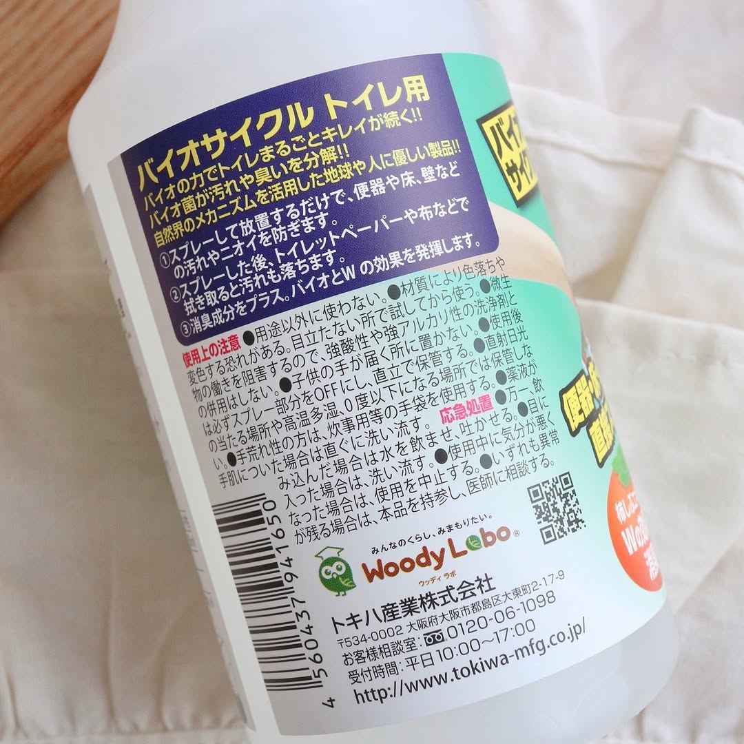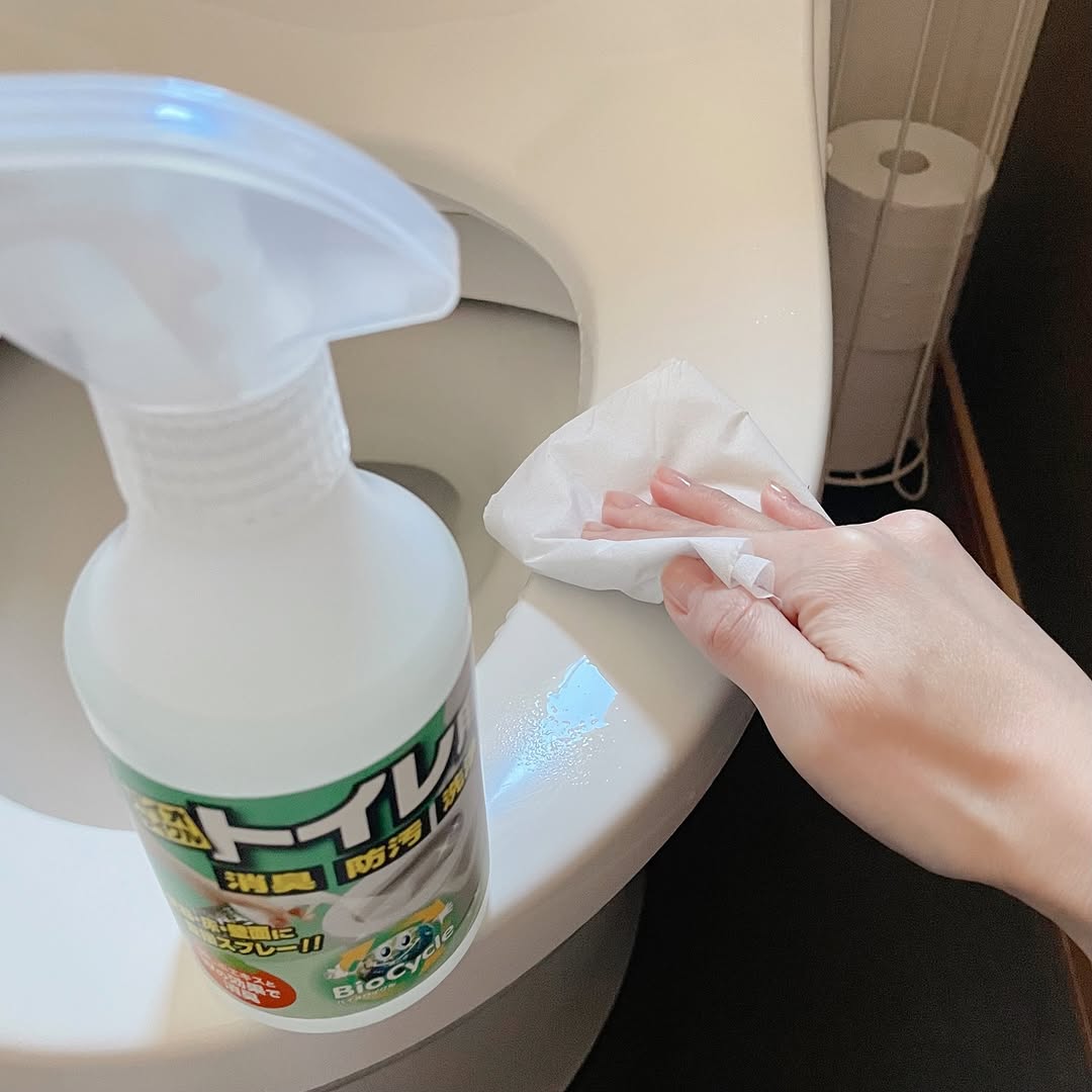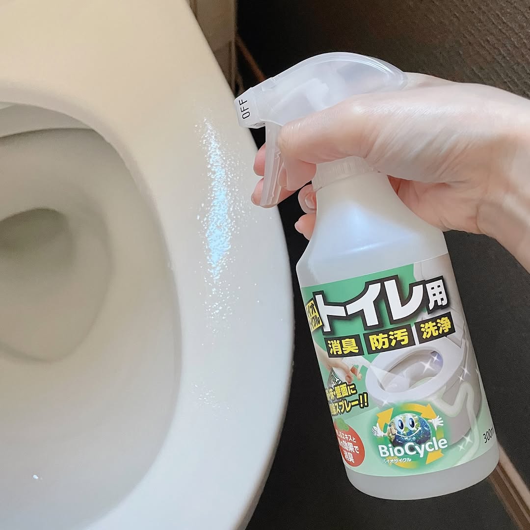 バイオサイクル トイレ用は、天然のバイオ菌が、汚れや臭いを分解!便器・壁・床・パイプ内までまるごとキレイが続くエシカル洗剤です。トイレ掃除後にスプレーするだけで、汚れが付きにくくなる防汚の働きもあるから、家事ラクまちがいなし!