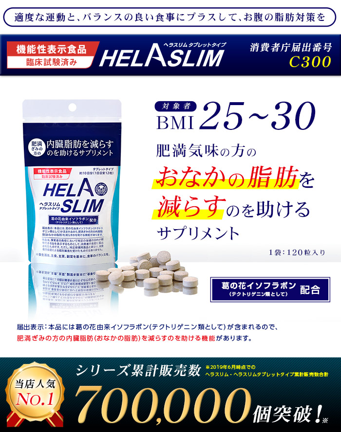 話題の機能性表示食品!内臓脂肪を減らすサプリメント『ヘラスリム』。『ヘラスリム』は、葛の花由来イソフラボン(テクトリゲニン類として)を配合した内臓脂肪(お腹の脂肪)を減らすのを助けるサプリメントです。葛の花由来イソフラボン(テクトリゲニン類として)には、内臓脂肪(おなかの脂肪)を減らすのを助ける機能があります。機能性表示食品(臨床試験済み)。