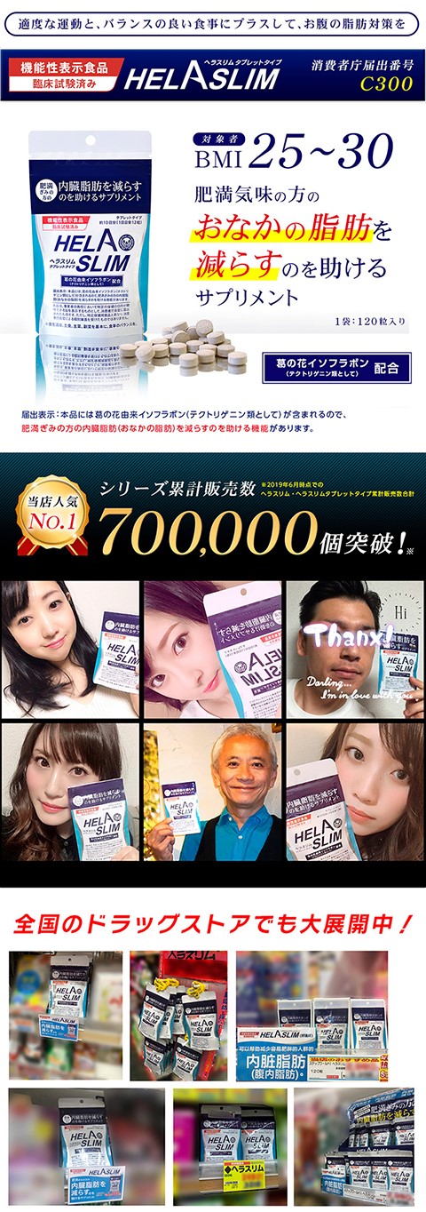 話題の機能性表示食品!内臓脂肪を減らすサプリメント『ヘラスリム』。『ヘラスリム』は、葛の花由来イソフラボン(テクトリゲニン類として)を配合した内臓脂肪(お腹の脂肪)を減らすのを助けるサプリメントです。葛の花由来イソフラボン(テクトリゲニン類として)には、内臓脂肪(おなかの脂肪)を減らすのを助ける機能があります。機能性表示食品(臨床試験済み)。