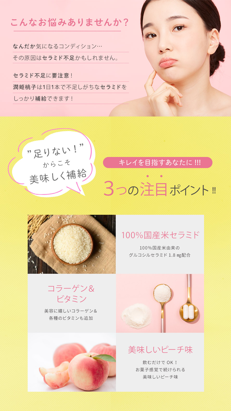 100%国産米由来のグルコシルセラミド配合。さらにコラーゲンや4種のビタミンも配合したパウダータイプのサプリメント。やさしい甘みのピーチ味。持ち運びしやすい分包スティックタイプで、いつでもどこでも気軽に楽しめるから続けやすい!1包あたり4.28Kcal