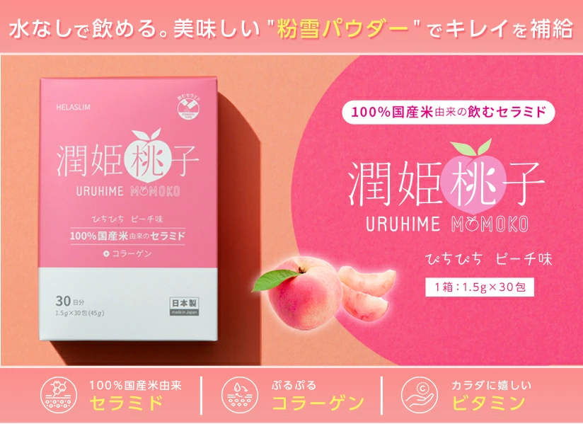 100%国産米由来のグルコシルセラミド配合。さらにコラーゲンや4種のビタミンも配合したパウダータイプのサプリメント。やさしい甘みのピーチ味。持ち運びしやすい分包スティックタイプで、いつでもどこでも気軽に楽しめるから続けやすい!1包あたり4.28Kcal
