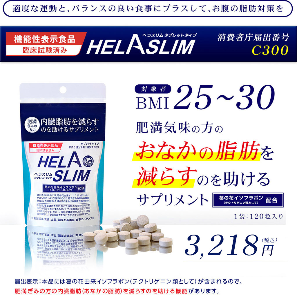 話題の機能性表示食品!内臓脂肪を減らすサプリメント『ヘラスリム』。『ヘラスリム』は、葛の花由来イソフラボン(テクトリゲニン類として)を配合した内臓脂肪を減らすのを助けるサプリメントです。葛の花由来イソフラボン(テクトリゲニン類として)には、内臓脂肪(おなかの脂肪)を減らすのを助ける機能があります。